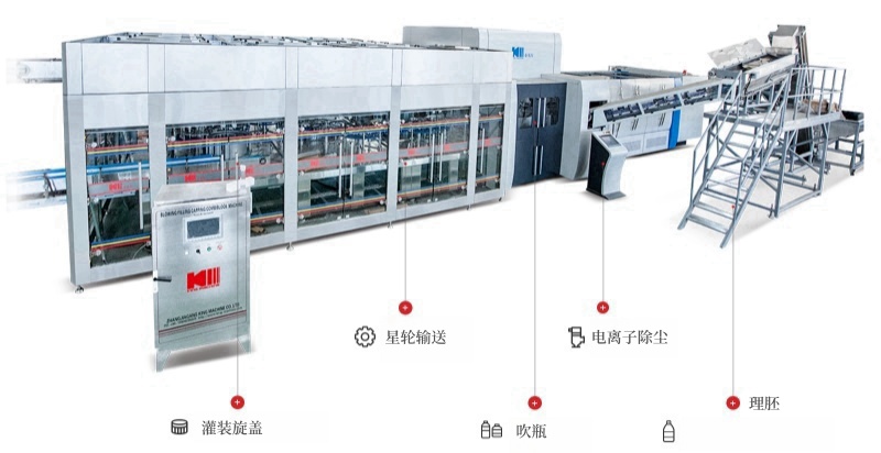 旋轉式吹灌旋一體機為旋轉式吹瓶機和灌裝機的優化結合,此系列廣泛應用于各種水類和飲料的生產。